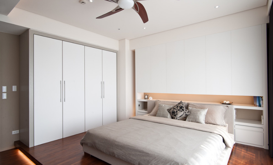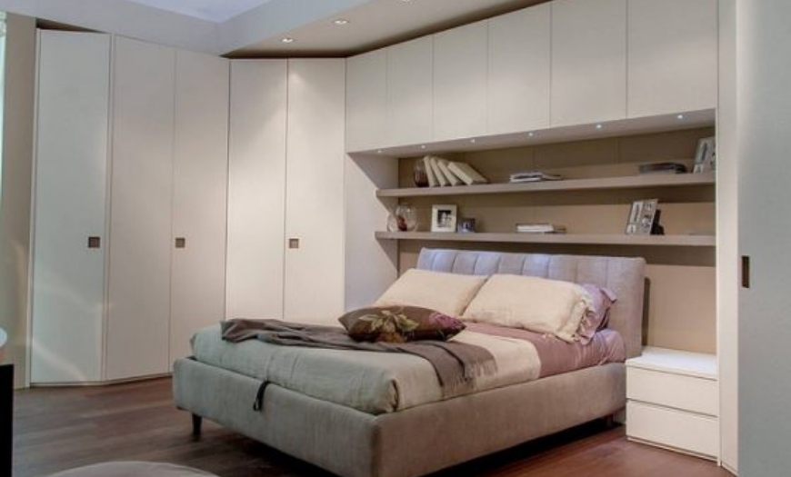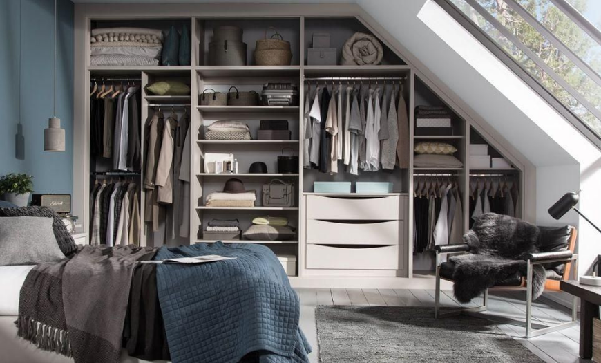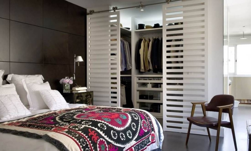 Зачастую комната отдыха предполагает наличие шкафов для хранения одежды. Вместительный гардероб, совмещённый с зоной для сна — популярное решение. Оба помещения выполняются в едином стиле, при этом гардероб отделяется раздвижными перегородками или стандартной дверью.