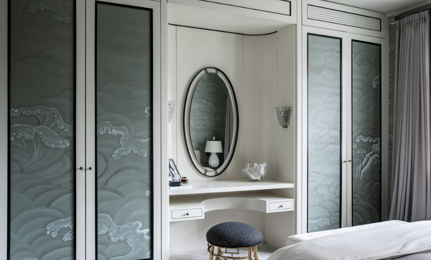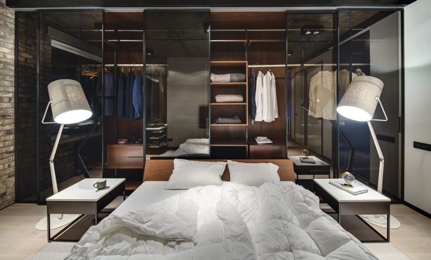 Закрытость зоны гардероба в ночное время создаёт в спальне атмосферу лёгкости, приятную для сна