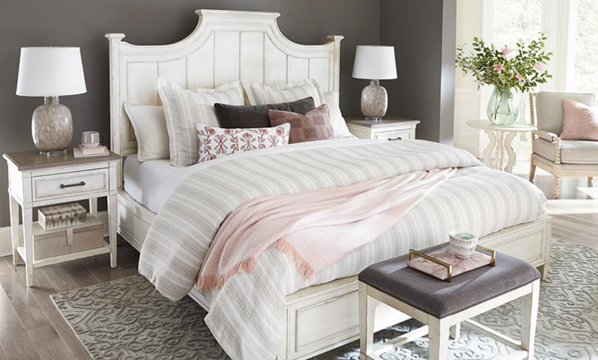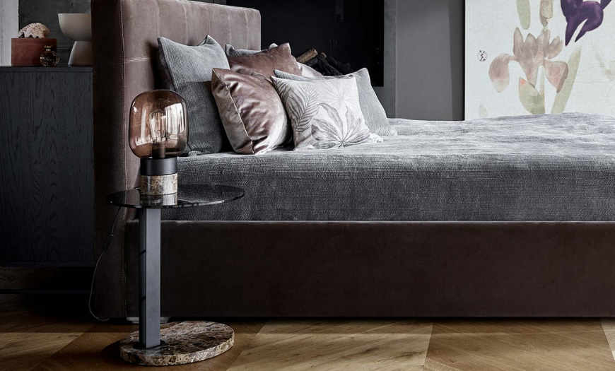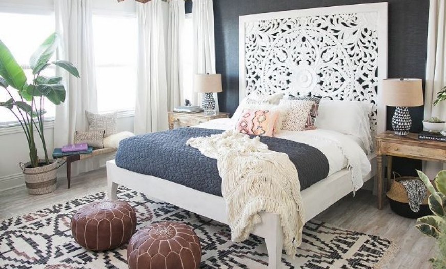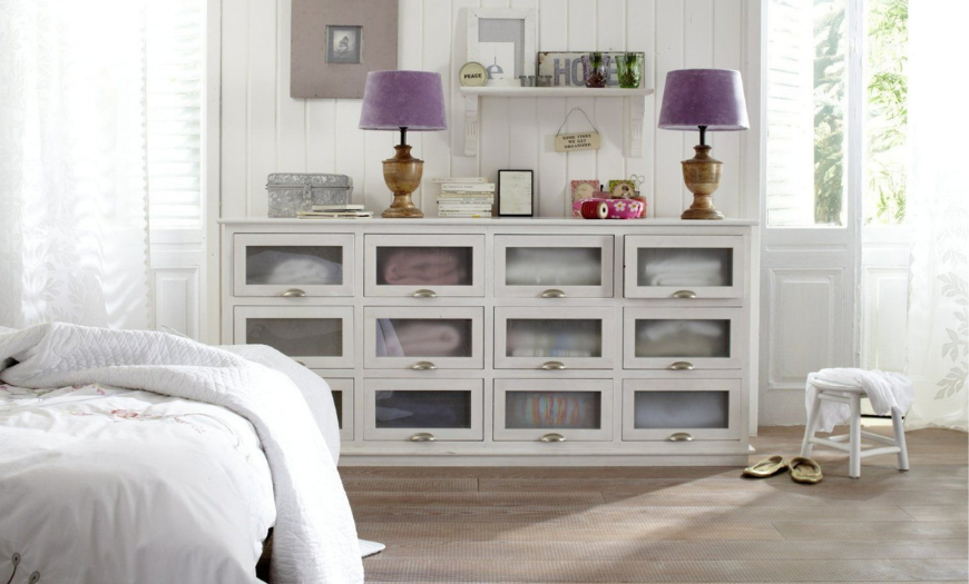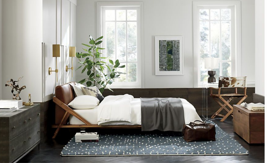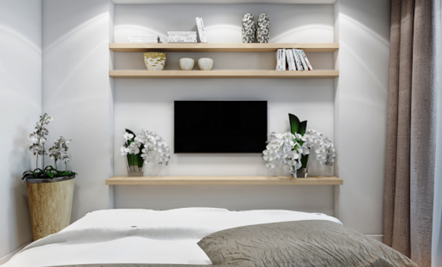 Стиль не терпит захламленности пространства, так что в комнате не должно появиться ничего лишнего. Компенсировать недостаток систем хранения поможет трансформирующаяся мебель. Телевизор предлагается отправить в нишу перегородки, разделяющей площадь спальни или закрепить на специальных кронштейнах на стене. Альтернативой напольным тумбам станут настенные полки.