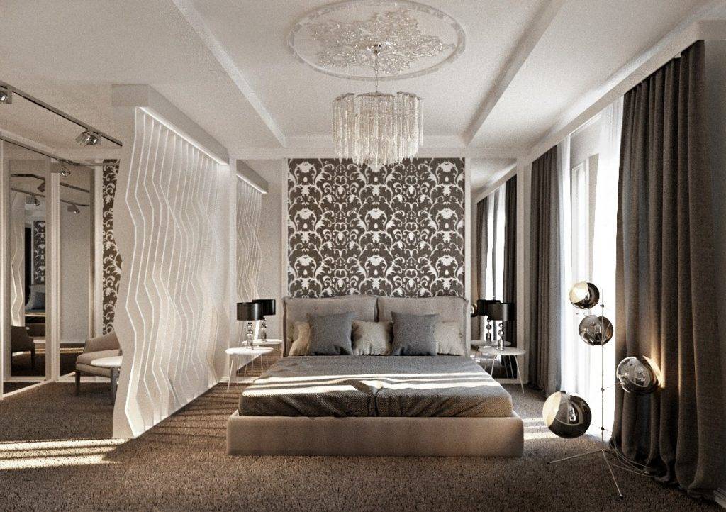 Монохромность дизайна легко разбавляется другими цветами, различными орнаментами и узорами. Их можно акцентно распределить на поверхности потолка и стен, постельных принадлежностях, гардинах. Профильные специалисты приветствуют использование контрастных цветов при оформлении дизайна современной бежевой спальни.