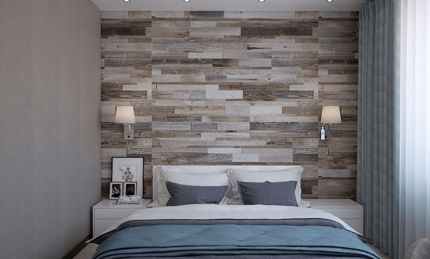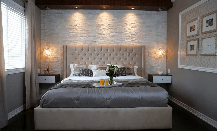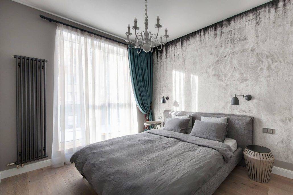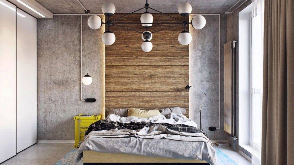 Оформление зависит от стилевого решения. Спальню с элементами лофт отделывают декоративной плиткой, имитирующей кирпич или брутальный камень. Штукатурка органично вписывается в разные интерьеры.
