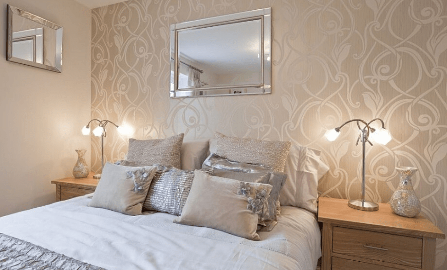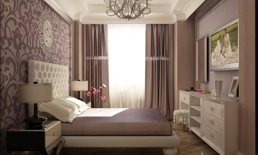 При выборе обоев для оформления небольшого помещения можно столкнуться с целым рядом ограничений. Сюда желательно выбирать светлые материалы, а от насыщенных и глубоких тонов лучше отказаться. В маленькой спальне нельзя клеить обои с большим и частым узором.