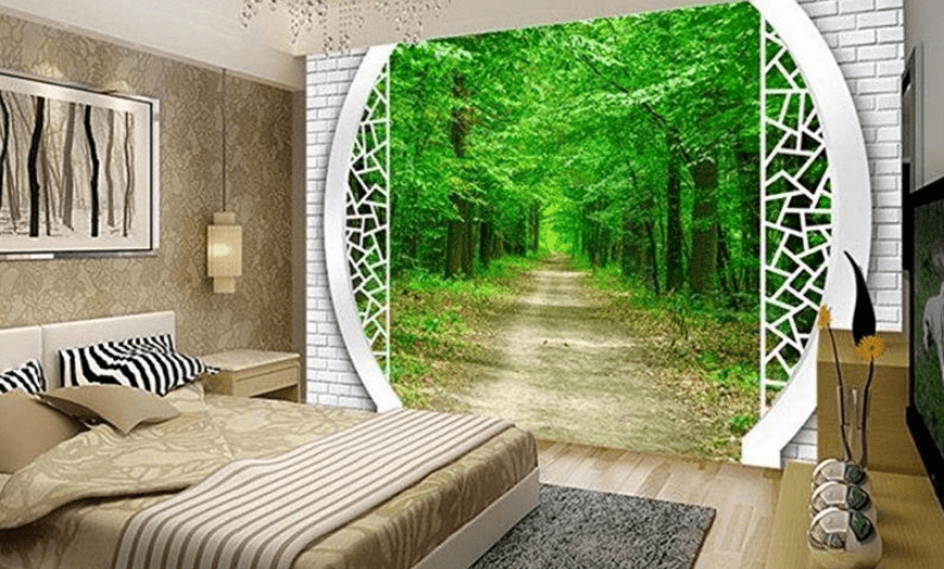 Оживят пространство фотообои, рисунок которых уходит вглубь – реалистичные небоскребы, лесная тропинка и т. п. Эффектно на стене за кроватью будут смотреться 3Д обои. Они не только скорректируют размеры комнаты, но и станут ее изюминкой.