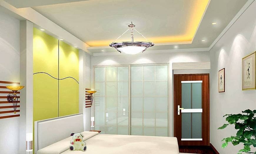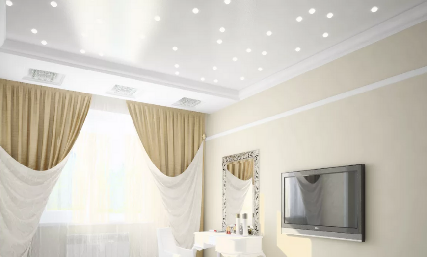 Важно выбирать источники с желтыми оттенками. Если комната имеет многоуровневый потолок, то в нижнем ставят точечное освещение
