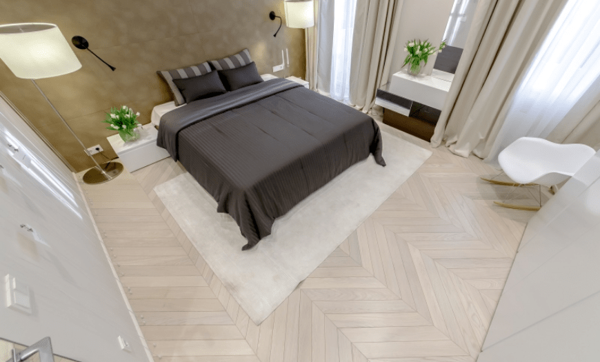 Что касается пола, то лучшим материалом станет ламинат или паркет светлых оттенков. Укладывать его нужно по диагонали, что также будет способствовать визуальному расширению. Для украшения подбирается ковер в тон мебели.