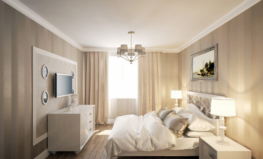 Оттенки белого также способны принести в спальню ощущение комфорта, благополучия и даже роскоши. Этот тип атмосферы легко получить путем сочетания белого с оттенками бежевого и золотисто-желтого в интерьере спальни. Большое значение в этой обстановке будет иметь выбор мебели.