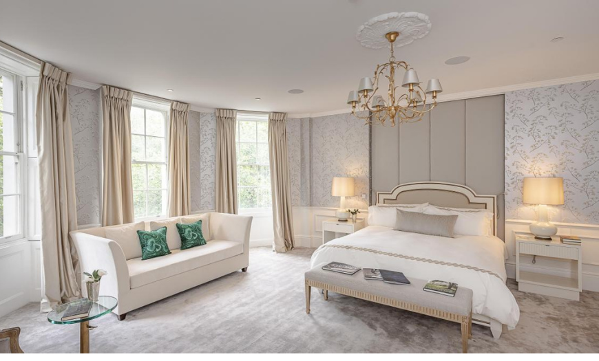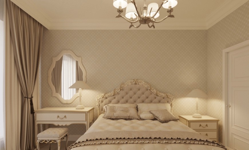 Классический интерьер спальни в светлых тонах сочетает роскошь барокко, ампира, викторианский стиль