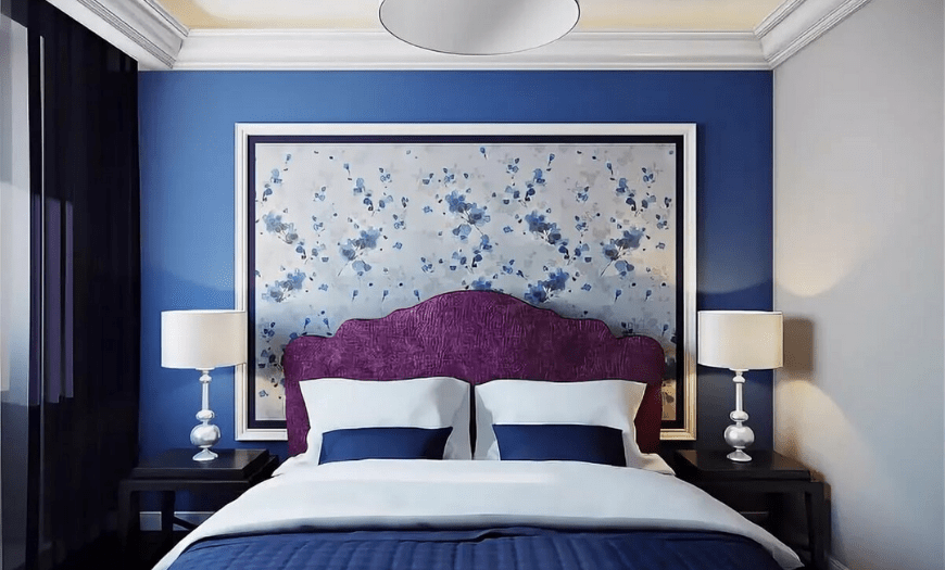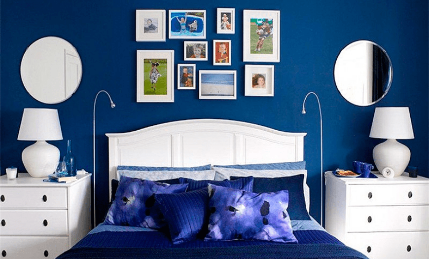 Но для небольшого помещения лучше использовать светлые, важно подобрать 1-2 основных оттенка, которые зададут общий настрой. Они хорошо сочетаются с белой мебелью, которая смотрится на синем фоне особенно выразительно.