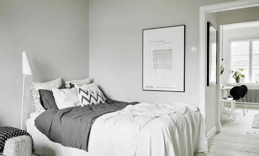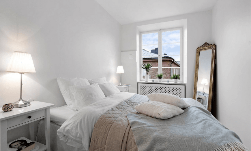 Скандинавский интерьер спальни в светлых тонах отличается минимализмом, отсутствием роскоши и предметов декора. Из цветов преобладают пастельные тона бежевого, серого, зеленого и коричневого, а основным цветом является белый. Мебель должна быть простой и изготовлена из светлого дерева, в качестве обивки подойдет лен, хлопок, замша.