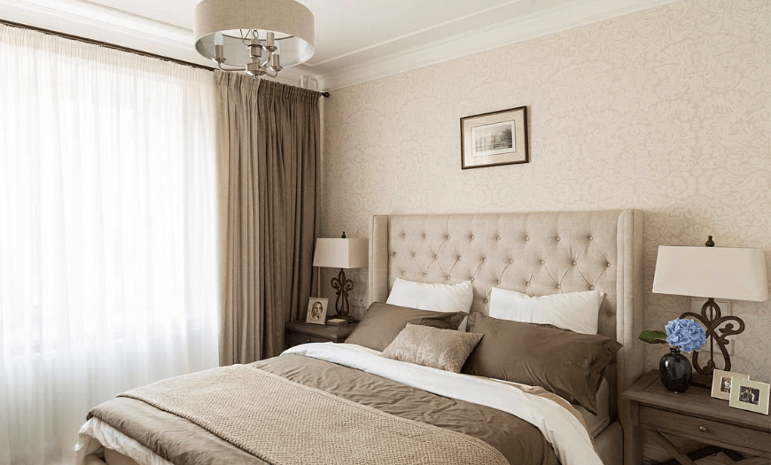 На фото классический интерьер светлой спальни, где отделка стен выполнена из обоев и использованы натуральные ткани для штор и текстиля.