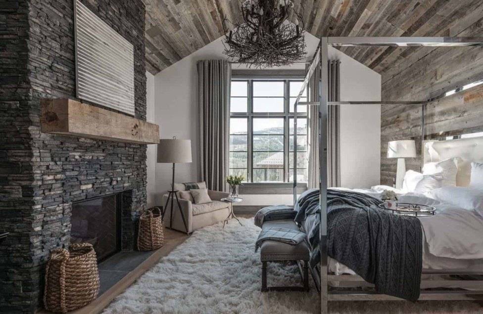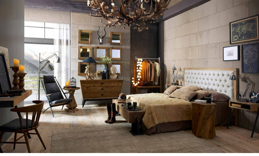 - Выглядит немного эклектично. Для обустройства спальни используется и практичная мебель с современным дизайном, и грубо обработанные модели из дерева и антикварные предметы.