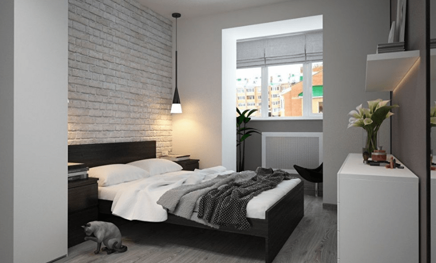 - Стены чаще всего делают однотонными. Это беспроигрышное решение для небольшой спальни. Можно поклеить обои. Лучше всего, если они будут с мелким геометрическим узором. Или же одну из стен оклеивают фотообоями, чтобы создать перспективу и зрительно расширить пространство. Если на поверхности будет использована имитация кирпичной кладки, лучше сделать ее белой.