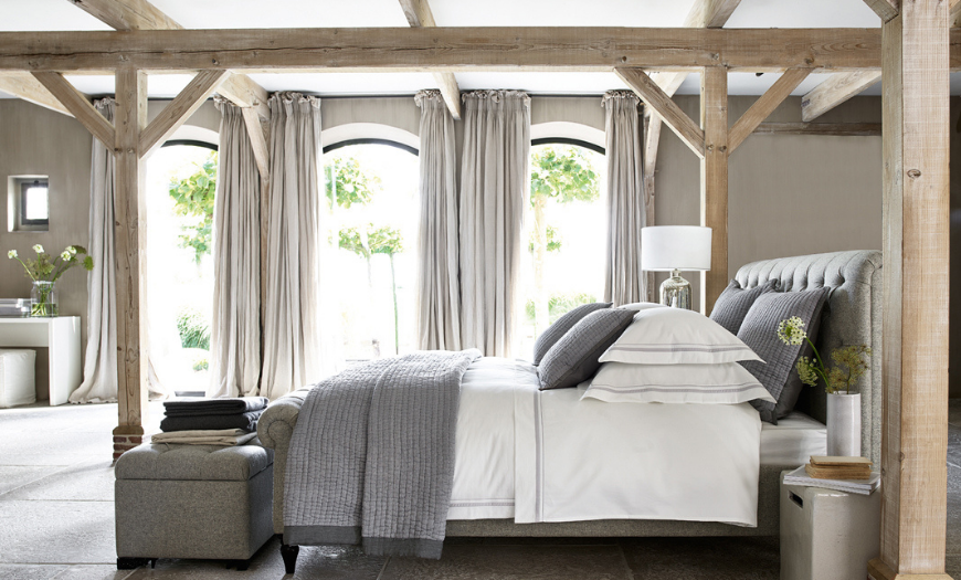 Если вы приняли решение оформить свою спальню в деревенском стиле, выбирайте исключительно натуральные текстильные элементы. Лучше всего подойдут льняные и хлопковые ткани.
