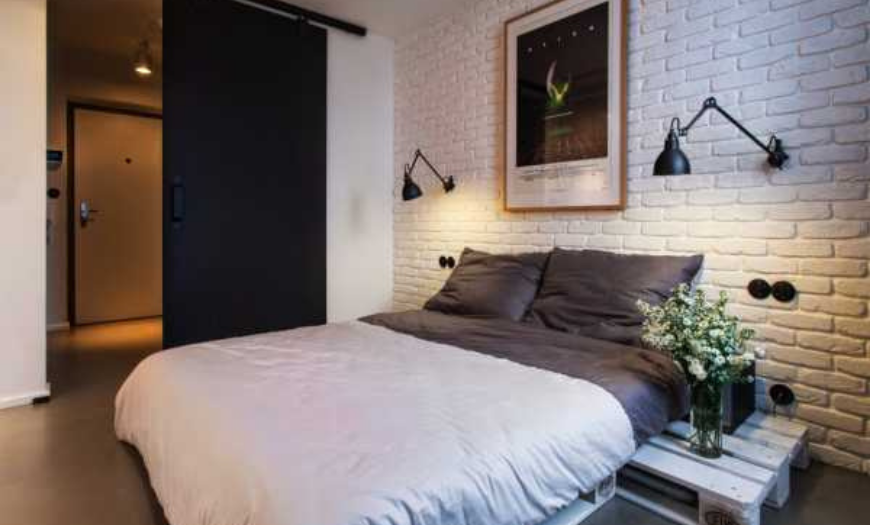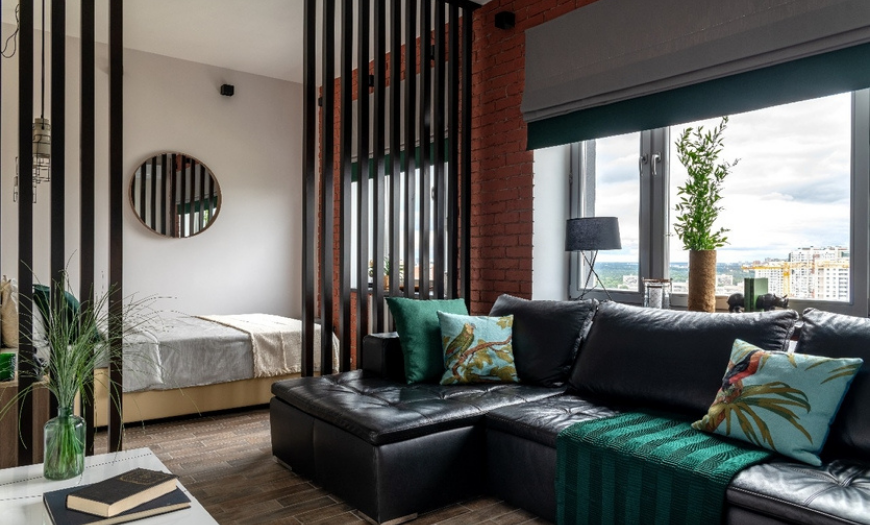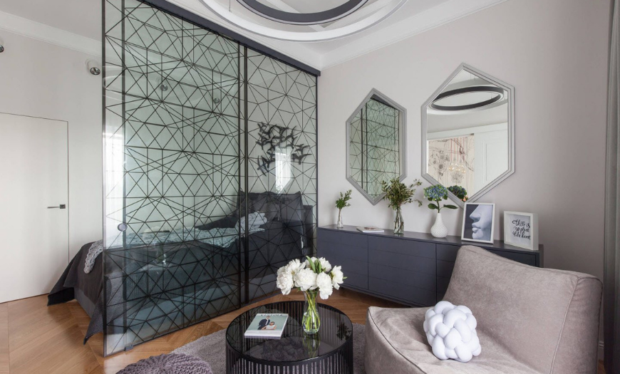 Совместить две разные функции в одном помещении — задача сложная, но выполнимая. Самое простое решение — зонировать пространство и скрыть спальное место от посторонних глаз с помощью гипсокартонной перегородки или портьеры.