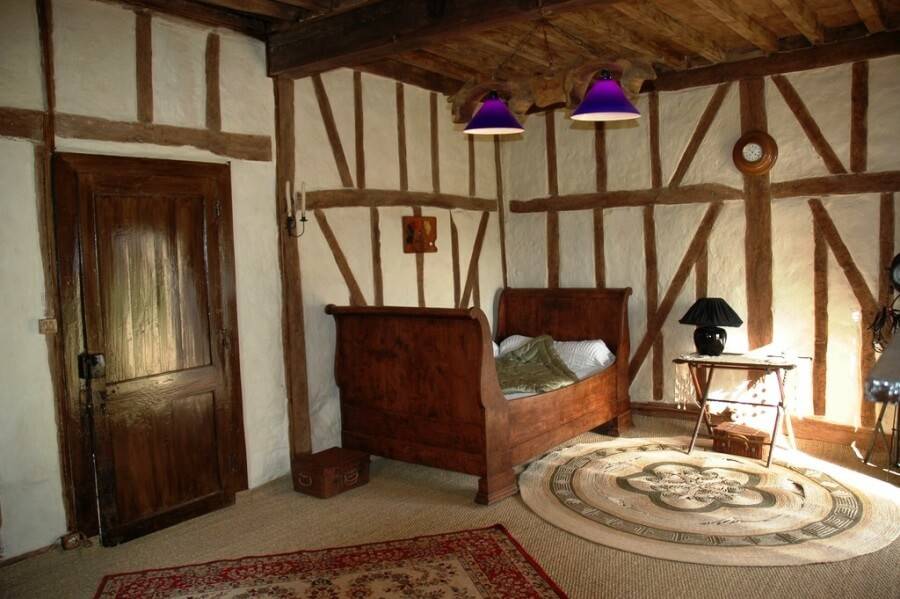 Среди других деталей, формирующих дервенский облик спальной комнаты, нужно выделить многочисленные снимки, на которых запечатлены члены семьи, красивые плетеные корзинки с коробами, самодельные ковры и пледы.