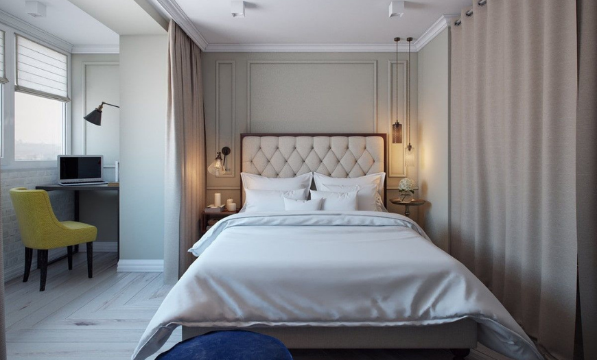 Еще один вариант мягко разделить пространство — шторы. При необходимости они сыграют роль перегородки, а в остальное время послужат дополнительным украшением спальни.