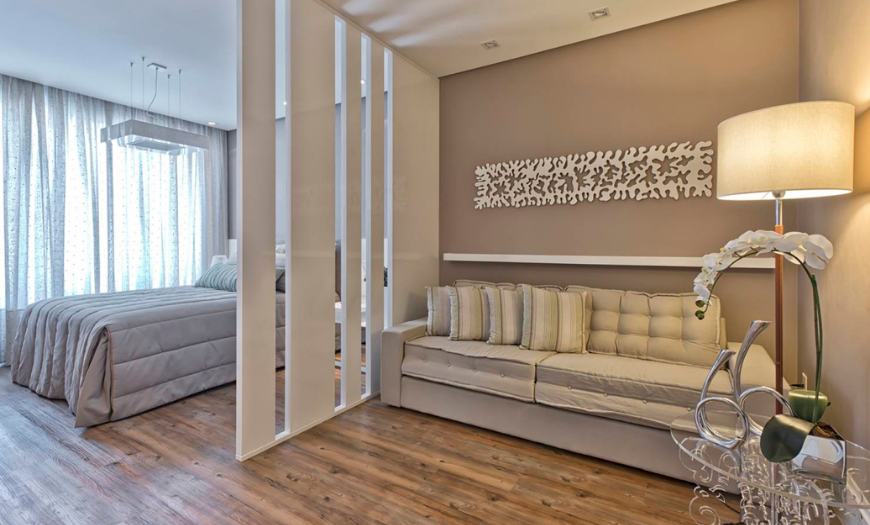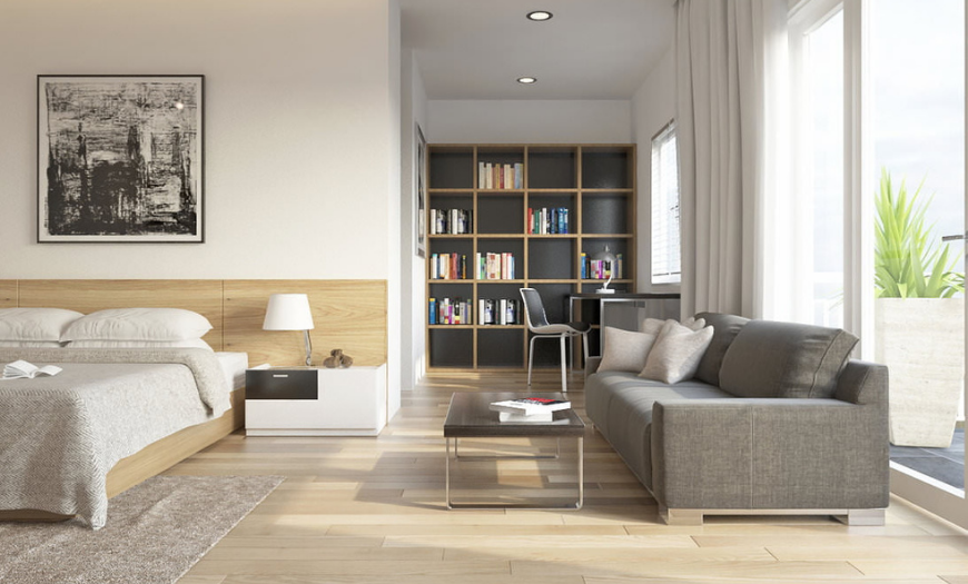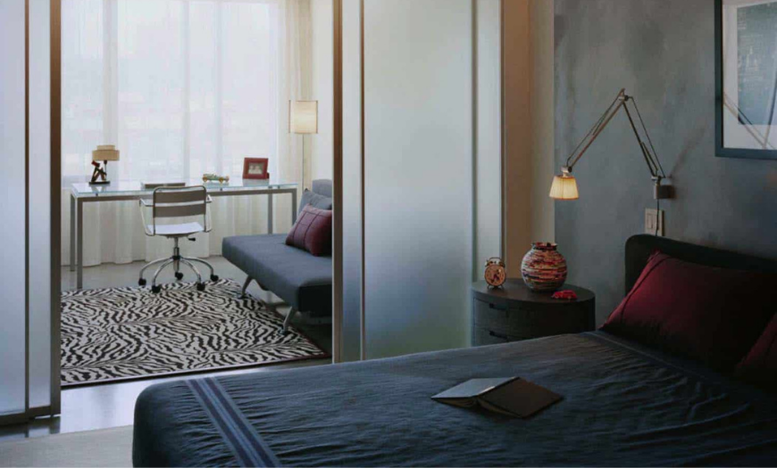 Совмещение рабочей зоны и зоны отдыха встречается часто. Оптимальным считается разделение помещения в пропорции 1 к 2, где большую часть занимает спальная.