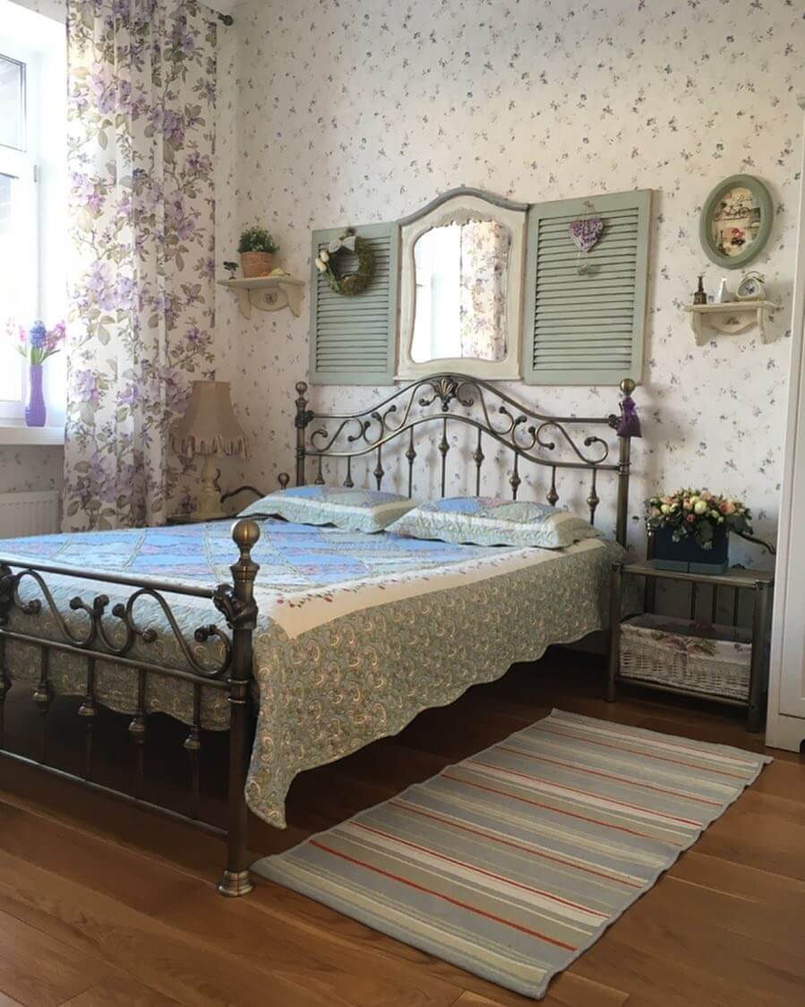 Любая комната для сна должна быть уютной, а в деревенском стиле — особенно. Центр комнаты — кровать (кованая, деревянная, с мягким изголовьем). По бокам — тумбочки с приятными сердцу вещицами.