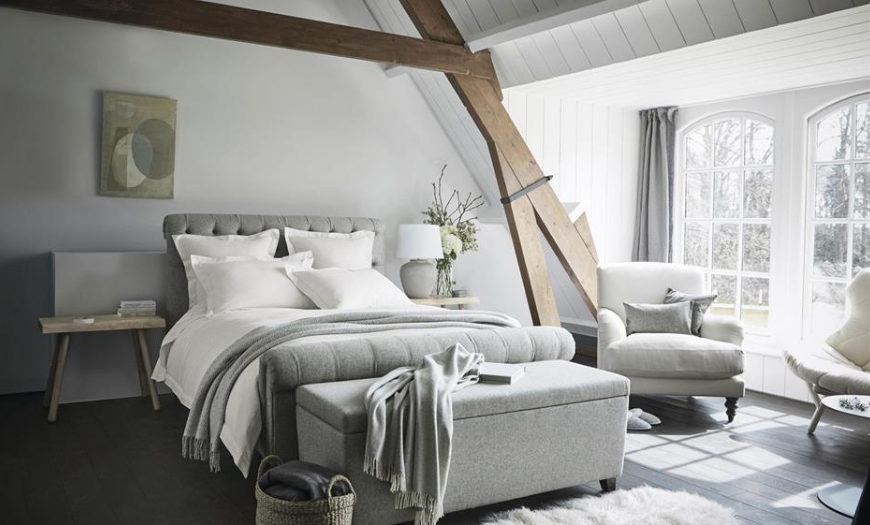 Поскольку скандинавский стиль идеально подходит для небольших пространств, многие хозяева устраивают спальню в мансардном помещении. Светлая гамма визуально расширяет пространство, а нестандартные оконные проёмы будут только преимуществом. Из-за своих размеров мансарда не сможет вместить большое количество мебели. Достаточно будет нескольких ящичков или комодов, пары-тройки стульев и кровати. Вместо громоздких шкафов используют полочки и открытые вешалки.