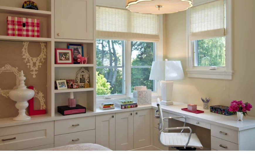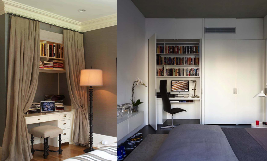 Интересное решение — встроить стол в шкаф. После работы можно закрыть дверцу и кабинет будет спрятан.