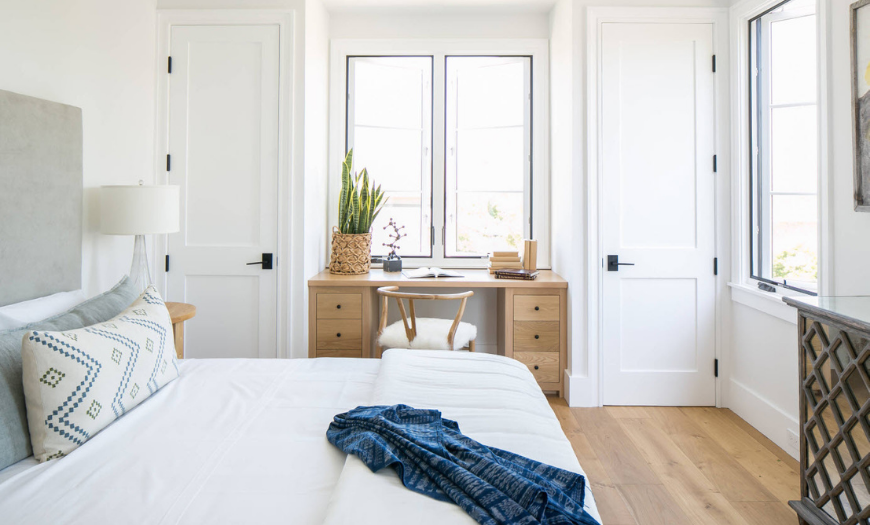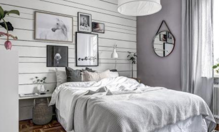 В спальне устанавливают большую дверь или вовсе отказываются от неё. Многие, вместо громоздких шкафов устанавливают открытые гардеробные. В скандинавском дизайне приветствуется свободная планировка, характерная для квартир-студий, владельцы объединяют спальню с ванной, кабинетом или даже столовой. При этом небольшие перегородки используют только для условного разграничения функциональных зон. Такой подход обеспечивает равномерное поступление солнечного света ко всем помещениям.