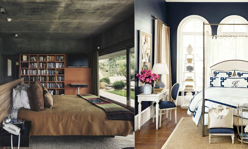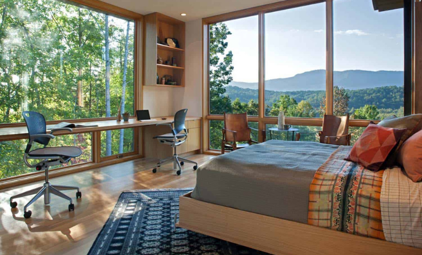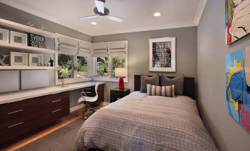 Разграничить кабинет и спальню можно с помощью оттенков цвета, фактурных материалов, мебели. Уместным будет книжный стеллаж, который хорошо дополнит рабочую зону. Письменный стол поставьте у окна — там больше света. При нехватке пространства его можно поставить возле кровати или вместо прикроватной тумбы.