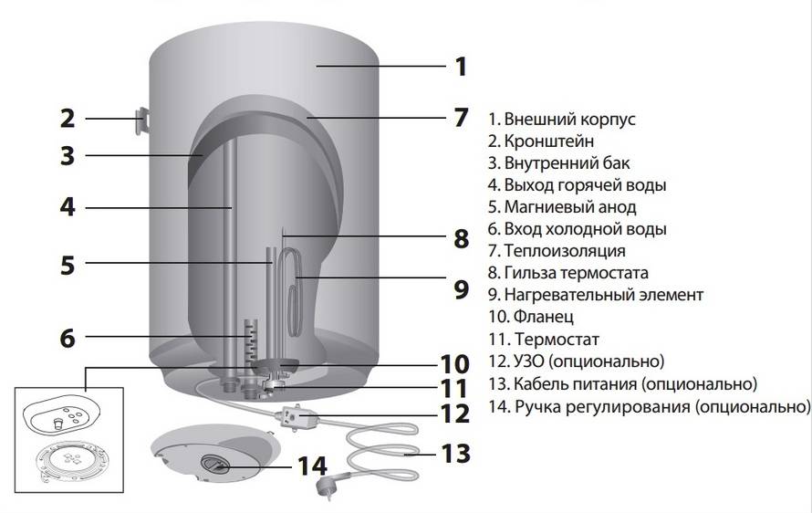 Водонагреватель в разрезе, виды нагревательные элементы бойлера и анод (по центру справа)