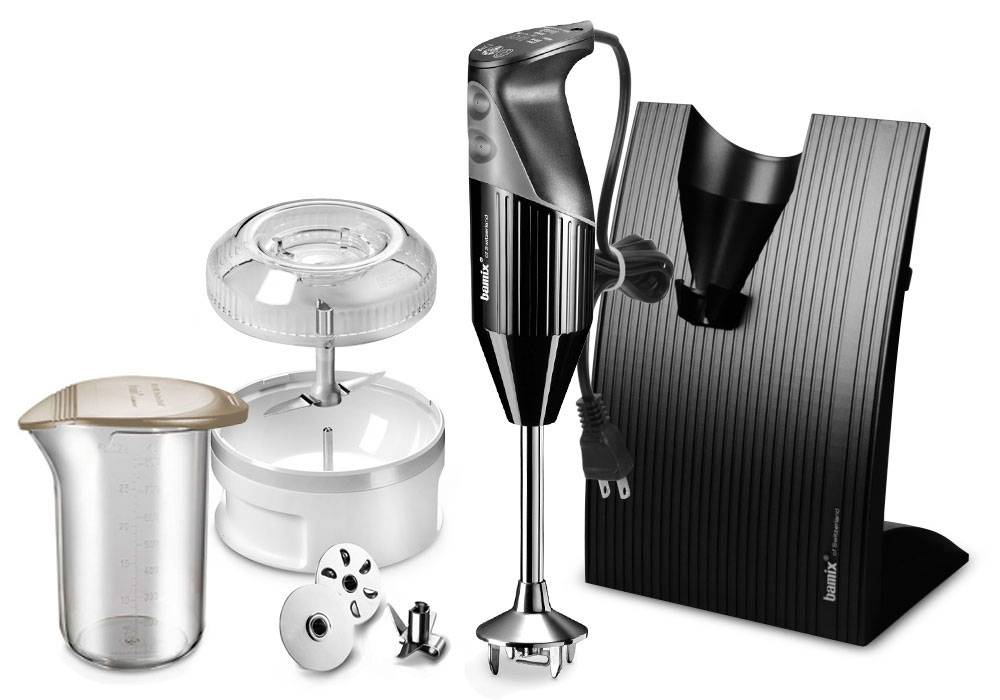 Существуют некоторые приборы, которые обладают функциями двух аппаратов, что порадует каждого покупателя – это погружной вариант современного устройства. Он укомплектован специальными насадками: венчик для взбивания, нож для измельчения. Бамиксы – во многом превосходят по практичности обычные кухонные приборы. Справляется с такими задачами: взбивание, тёрка, шинковка продукции.