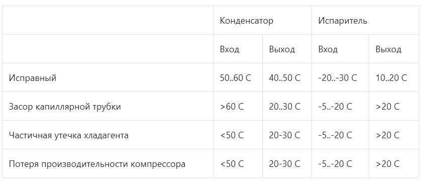 Температурные режимы — у каждого бытового холодильника есть цикл работы, который состоит из периода работы и отдыха, а так же из величин нагрева конденсатора и испарителя (-20 это тоже температура нагрева) принято считать, что идеальная температура нагрева конденсатора в начале (у компрессора) + 55 градусов, на конце (у фильтра осушителя) +45 градусов, при этом контур испарителя должен быть температуры от +10 до +20 градусов на входе компрессора и до -25 градусов на входе в испаритель капиллярной трубки.