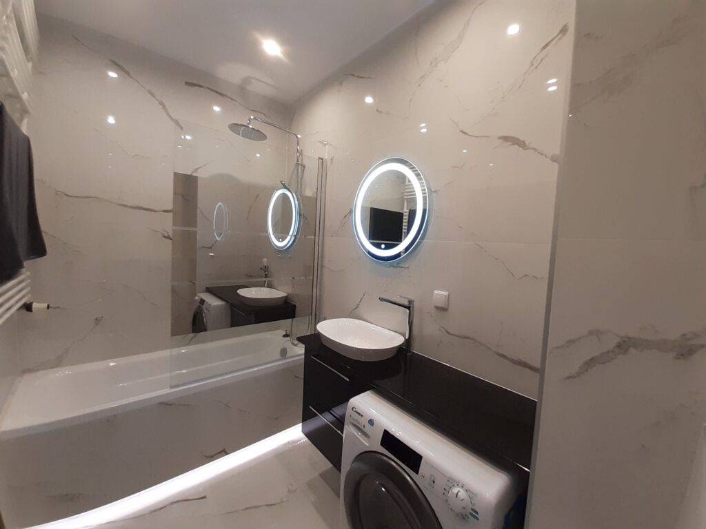 Монохромная отделка в бело-серой гамме. За счет светлых оттенков, подсветки и оконного проема, площадь выглядит просторной, несмотря на реальные габариты. Поверхность кафеля отсвечивает жемчужным блеском, расширяя тем самым визуальные границы стен.