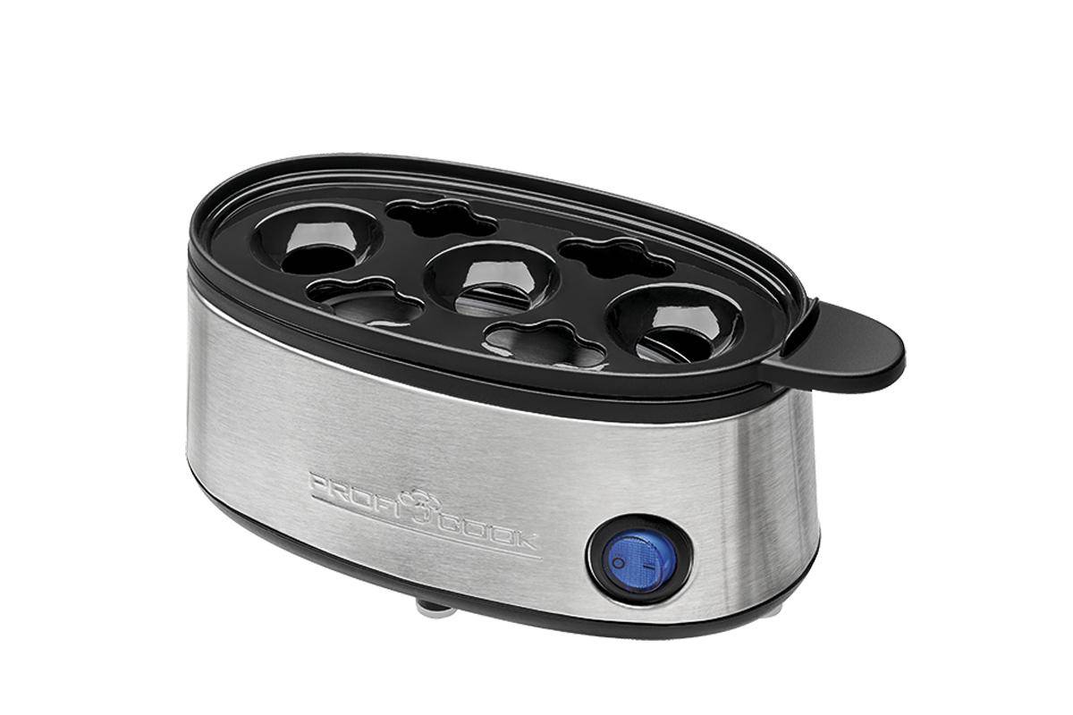 Ничего лишнего не имеет яйцеварка Profi Cook PC EK 1124 из нержавеющей стали. Из управления только кнопка старта с синей подсветкой. О готовности продукта сообщает звуковой сигнал. Мощность нагревательного элемента – 300 Вт. Рассчитана яйцеварка электрическая на 3 яйца и оснащена съемным держателем. Имеется защита от перегрева.