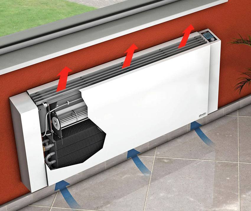 Работают они очень просто – при включении газа, подаче горячего теплоносителя или электроэнергии происходит нагревание ребристого нагревательного элемента, который начинает прогревать воздух. Воздушные массы становятся более легкими, отправляясь вверх. За этим процессом внимательно следит автоматика, регулирующая нагрев. В это же самое время в конвекторы поступает холодный воздух, который обволакивает нагревательный элемент – цикл повторяется.
