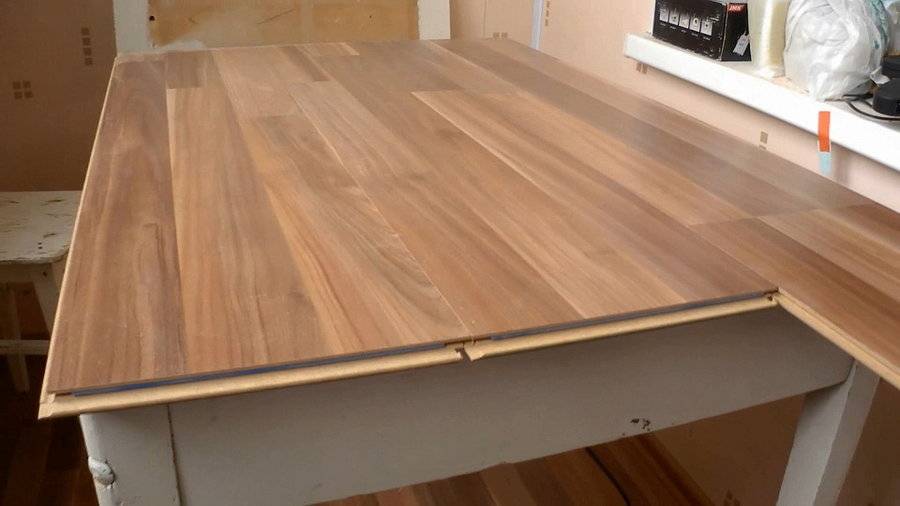 Отделка столешницы из остатков ламината может быть контрастной или в тон полу. Интересно выглядят наборные варианты с переходами цвета или контрастными вставками. Они придают обшивке стола особенную оригинальность, хорошо сочетаются с покрытием из стекла, прозрачными скатертями.