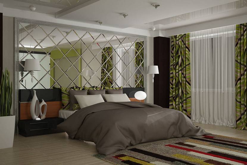 В роли фацетного зеркала в интерьере спальни лучше всего будет смотреться акцентная зеркальная стена — расположить ее можно за изголовьем кровати, там она будет наиболее заметной. Такая современная и стильная отделка станет еще и функциональной, так как позволит не устанавливать в комнате обычное гардеробное зеркало.