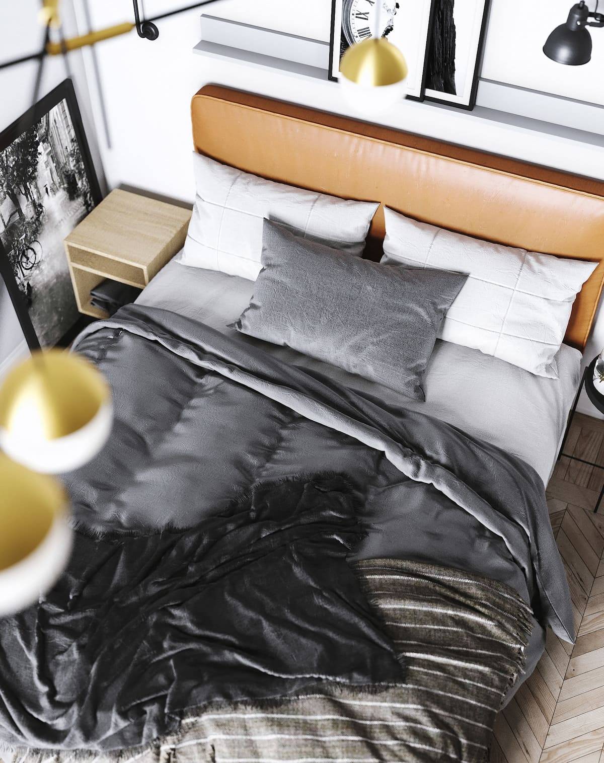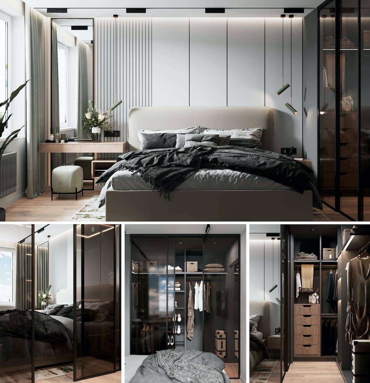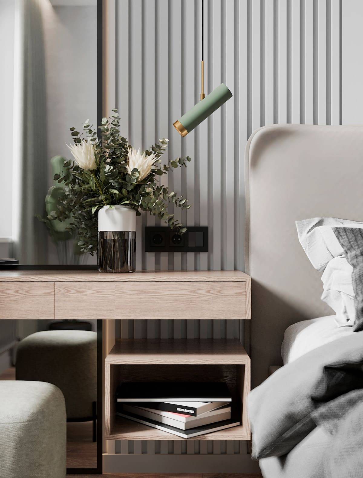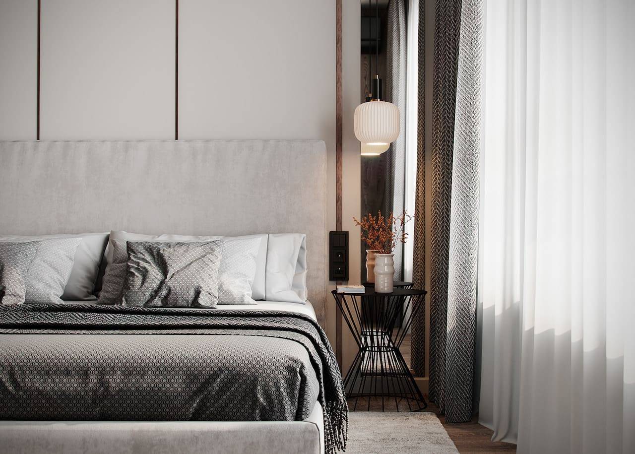 Насыщенные стены будут действовать возбуждающе и не дадут расслабиться, а вот пастельные приглушенные оттенки как раз подойдут для помещения: теплый бежевый поднимет настроение, бледно-зеленый успокоит, а светло-голубой отвлечет от рутинных мыслей. Однако, это не значит, что в спальню нельзя добавить красок. Пара цветных пятен в виде пестрых гардин или постельного белья всё же не помешает.