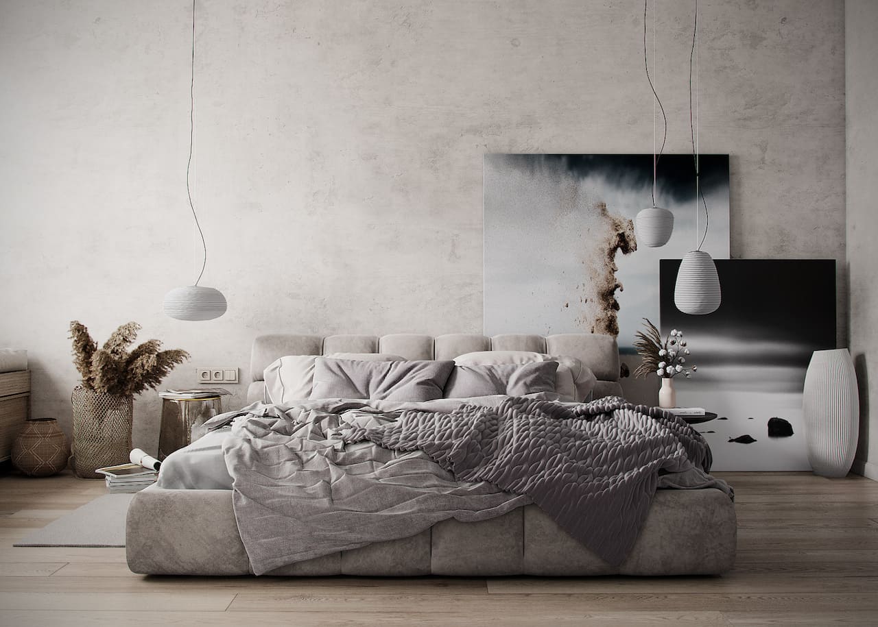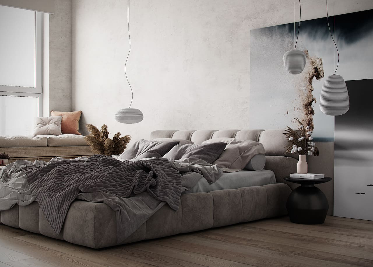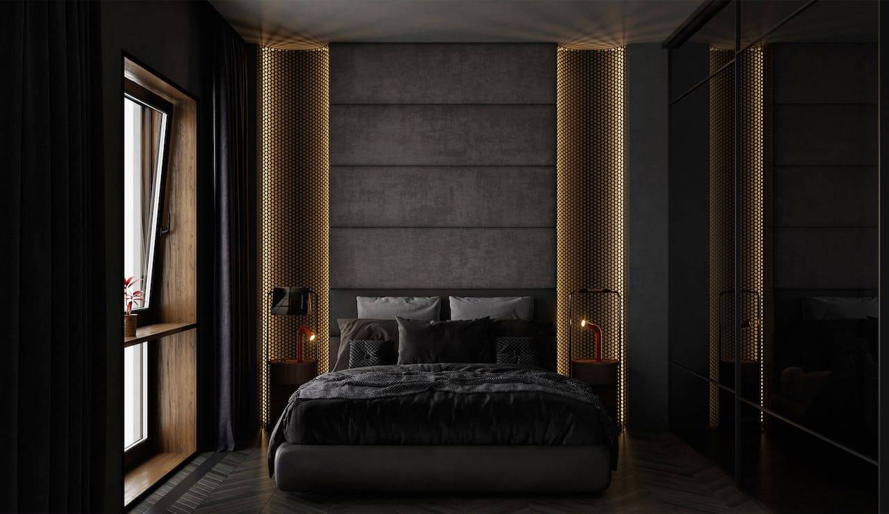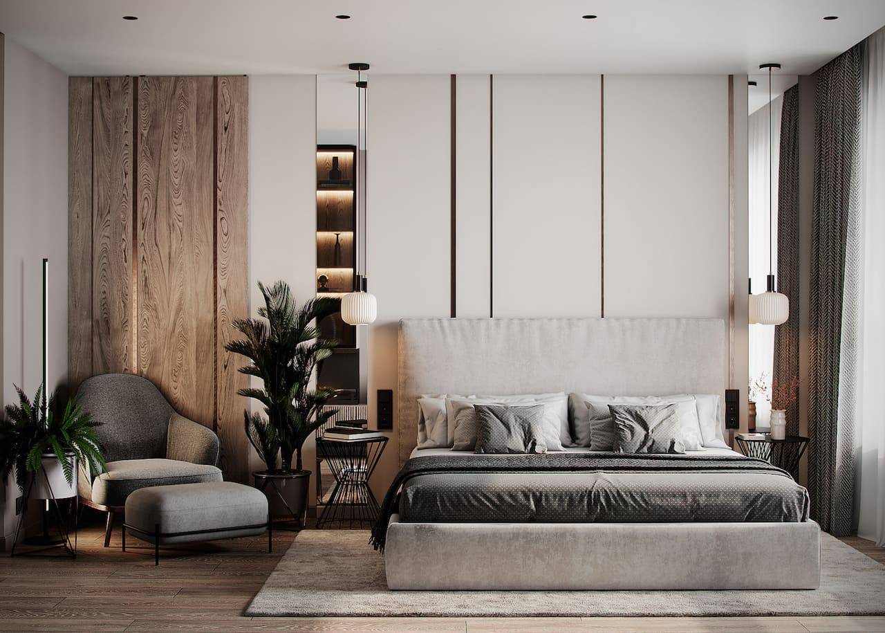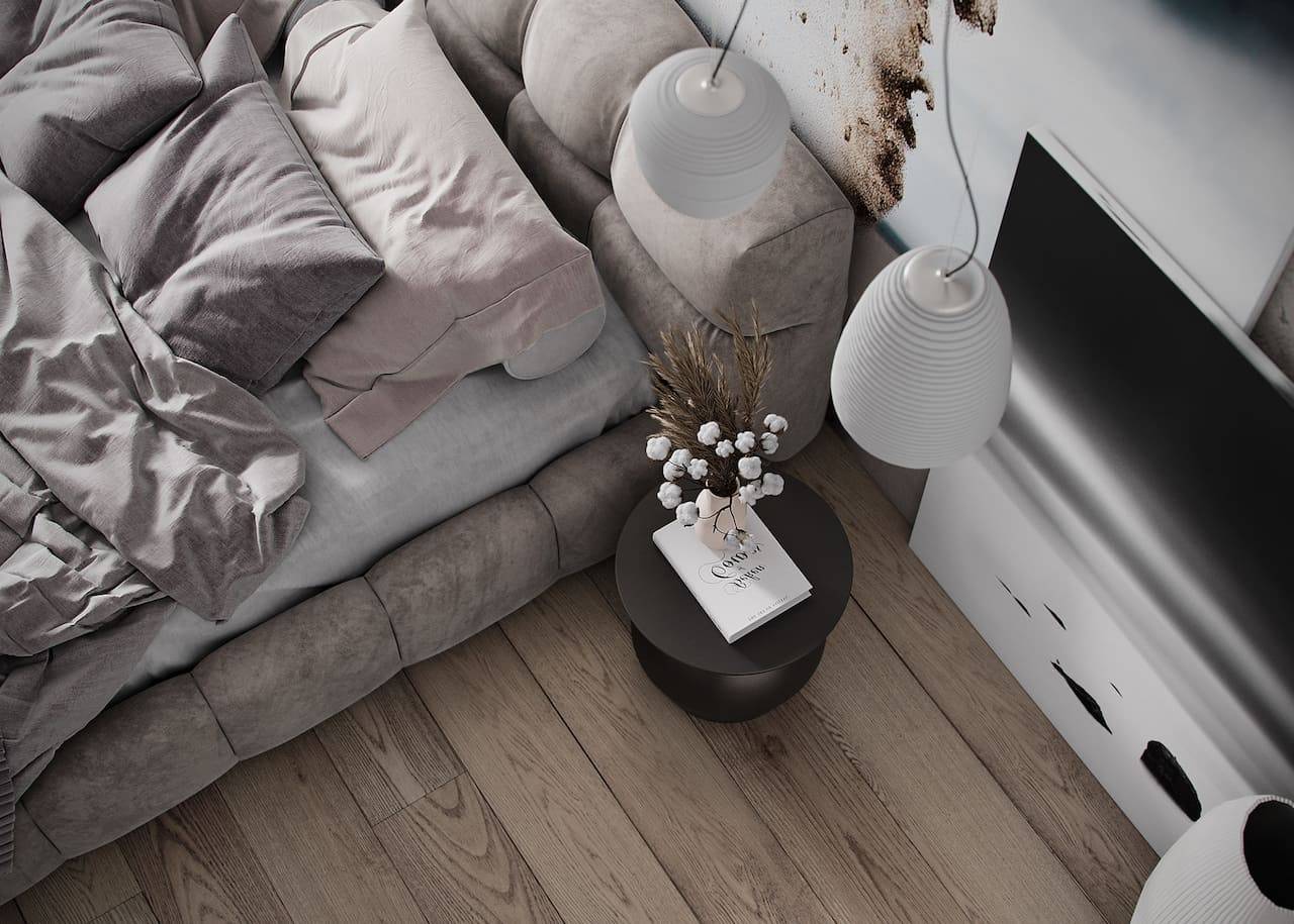 Насыщенные стены будут действовать возбуждающе и не дадут расслабиться, а вот пастельные приглушенные оттенки как раз подойдут для помещения: теплый бежевый поднимет настроение, бледно-зеленый успокоит, а светло-голубой отвлечет от рутинных мыслей. Однако, это не значит, что в спальню нельзя добавить красок. Пара цветных пятен в виде пестрых гардин или постельного белья всё же не помешает.