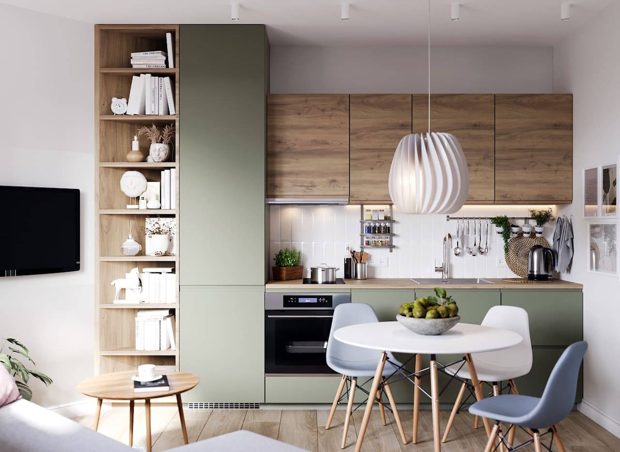 Куда добавить красок? Следуя трендам, яркие цвета в интерьере кухни стоит компоновать с более нейтральным декором, чтобы стены не «спорили» с мебелью, её желательно подбирать в спокойной палитре. Можно ярко оформить все стены, а можно сделать фартук над рабочей поверхностью.