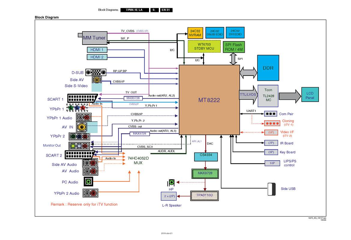 Ядро системной платы представляет центральный процессор MT8222, который выполняет большинство функций возложенных на этот блок, совместно с устройствами хранения и обмена информацией DDR, SPI Flash ROM, NVRAM. Памяти EDID предназначены для согласования внешних устройств с технологией Plug and Play с шасси телевизора, позволяя ему распознавать подключенное внешнее оборудование и подстраиваться под него без вмешательства пользователя, или сводя его к минимуму. Тюнер и канал звука обязательны для основной платы, а процессор WT6703 STDBY MCU исполняет команды от пульта управления и клавиатуры. Видеосигнал, преобразованный по определенному алгоритму, подается по шине LVDS на контроллер матрицы (Tcon), выполненный обычно отдельным блоком, и далее на панель LCD.