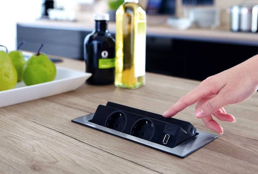 Розетки на рабочей поверхности выбираются в цвет кухонного фартука или под