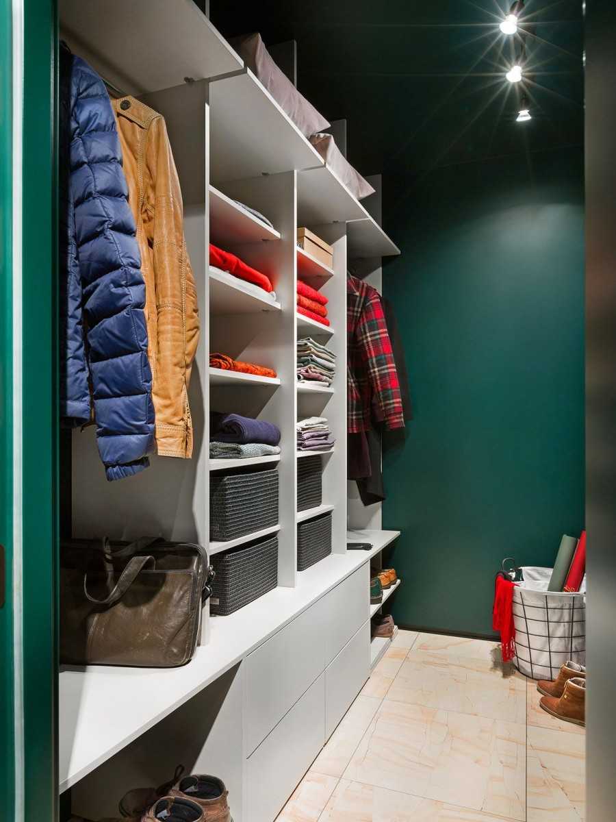 Встроенная гардеробная позволяет максимально сэкономить место, а присутствующий функционал весьма удобен для использования. Но причиной экономии поспособствует отсутствие дверей. В этом случае придется постоянно следить за положением своих вещей, чтобы избежать визуального бардака. Но для самых ленивых есть выдвижные ящики и шкафчики. Они весьма вместительны и очень удобны. А значит все вещи находятся рядом, и не придется тратить время на их поиски. И самое главное, что каждый предмет будет сохраняться в безопасном месте, где ему не грозит ни пыль, ни грязь.