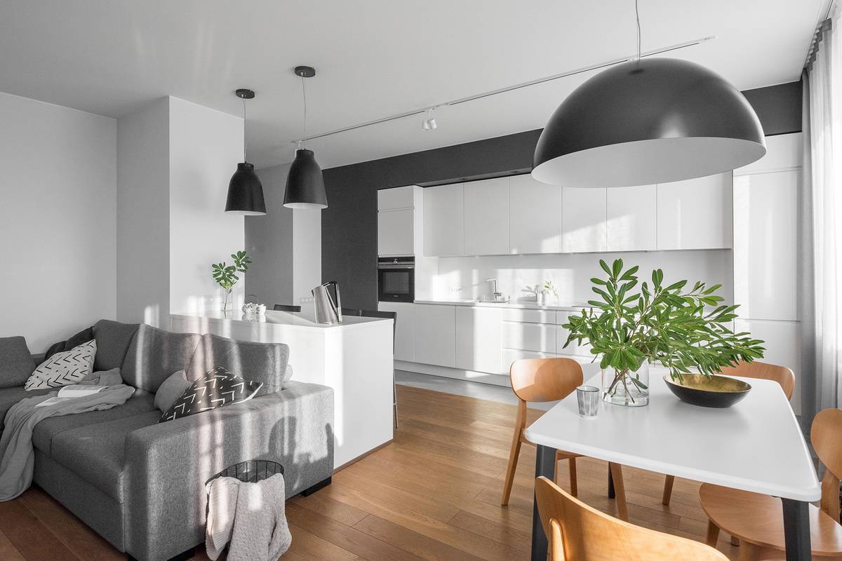 Другой вариант – выбрать 2-3 основных цвета и повторить их по всему пространству гостиной-кухни или квартиры-студии. Такие решения будут сглаживать резкий переход между зонами в пространстве.