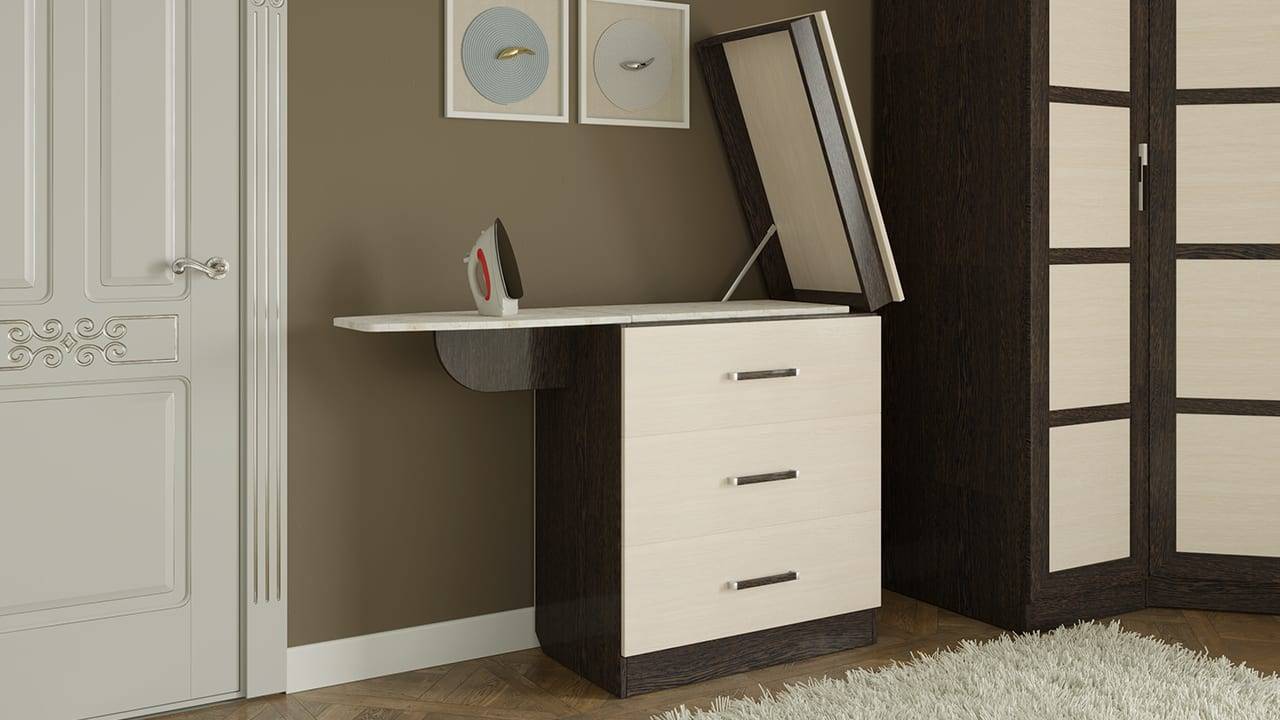 Для спальни, ванной или лоджии можно заказать мини-комод, столешницей которого будет гладильная доска. Внизу размещаются отсеки, куда можно складывать неглаженные или поглаженные вещи, утюг, аксессуары к нему, швейные принадлежности и многое другое. Выглядит такая конструкция очень симпатично и совершенно не портит интерьер.