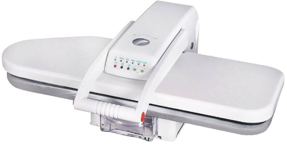 Бюджетное изделие, которое справится с различными материалами, главное правильно выбрать режим. Изделие обладает точным электронным регулированием. Конструкция надежно закрывается, что помогает без проблем перемещать пресс. Кнопки подачи пара присутствуют с двух сторон, что удобное решение. Кроме того, оборудование дает возможность досушить белье во время глажки.