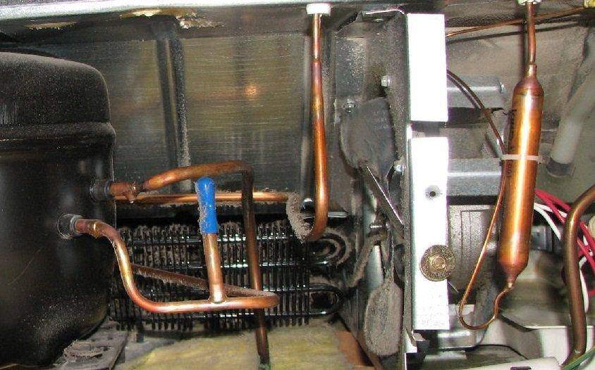 - Утечка фреона или поломка терморегулятора. Провести диагностику достаточно просто: нужно дотронуться рукой до конденсатора. Его температура становится аналогичной комнатной. Компрессор будет продолжать работать, но температура в камерах не будет соответствовать установленной ранее. Если сломался терморегулятор, то звуковой сигнал просто-напросто не будет поступать.