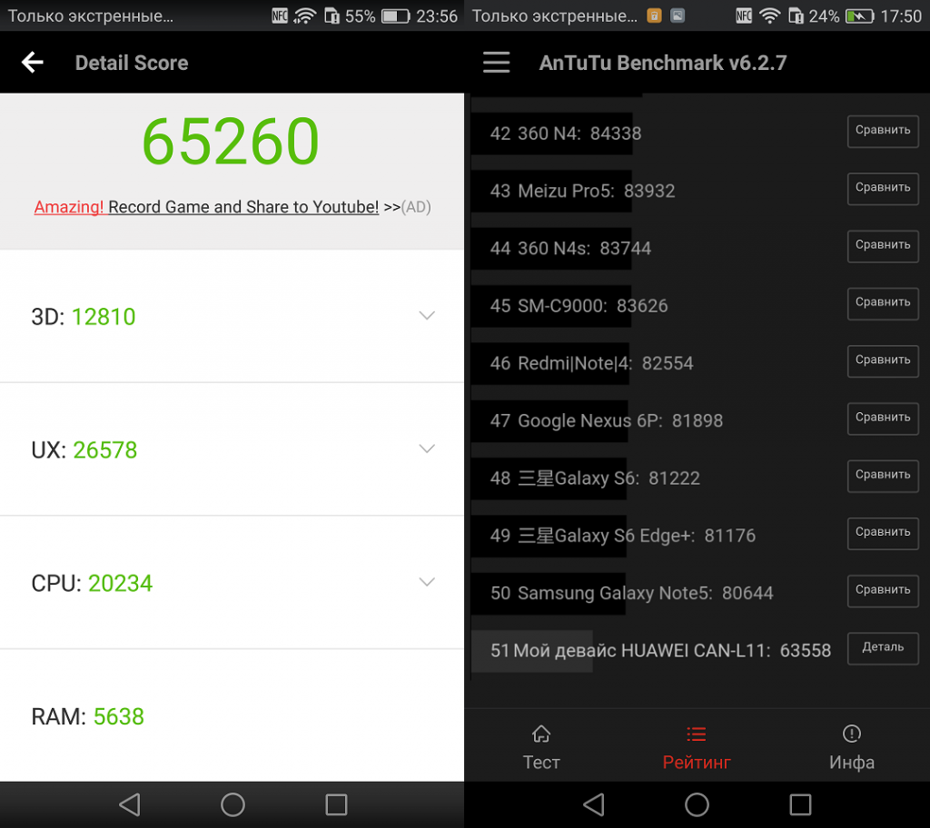 Зато у версии Huawei Nova Plus все 8 ядер имеют частоту 2,0 ГГц. Бенчмарки, в том числе антуту, игры показывают высокую производительность. Только танки иногда тормозят на максимальных настройках. После продолжительной работы телефон сильно нагревается. Лучше запускать игры на средних настройках. Huawei Nova 2i в тестах Antutu набирает 63 тыс. баллов.