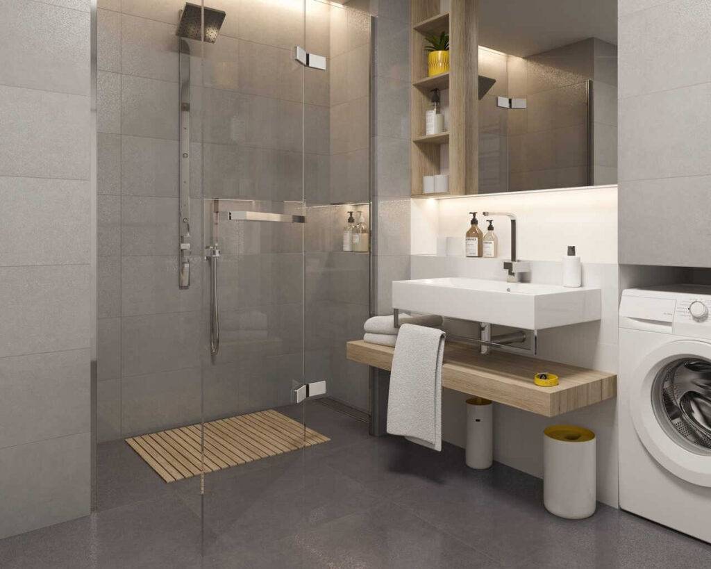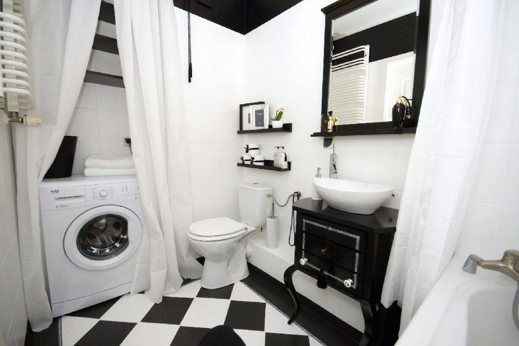 Маленькая ванная комната с душем и стиральной машиной