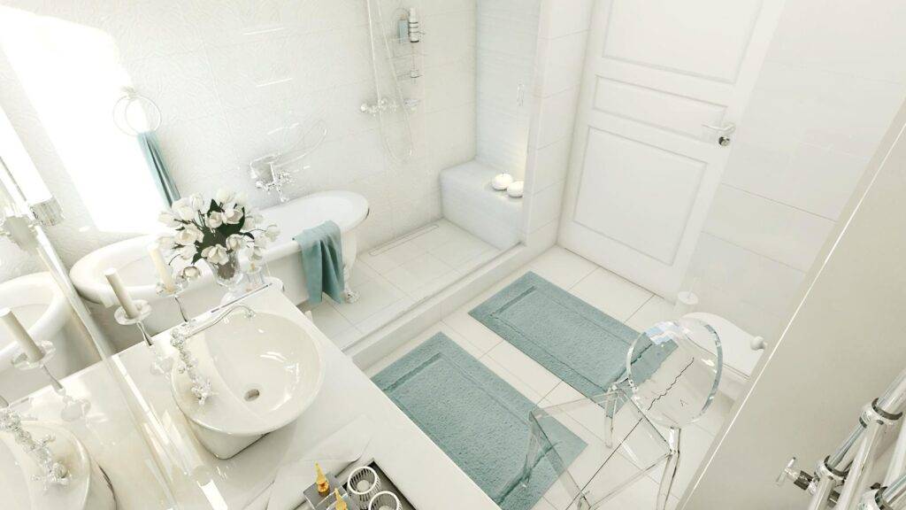Цветной коврик может стать ярким акцентом, а коврики спокойных оттенков не будет выбиваться из общего интерьера. Ёмкости для шампуней, мыла и гелей нужно выбирать в одном стиле, штора для душа должна сочетаться с плиткой или ковриком.