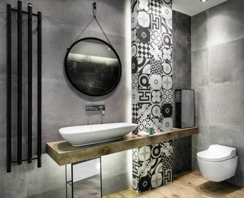 Седьмой проект, в свою очередь, представляет собой сочетание материалов и цветов, достойное как минимум «Оскара» за дизайн. Дерево, бетон и бутылочный зеленый — это трио недавно захватило мир дизайна. Все это дополнено черными деталями, которые вместе с рамками зеркала приближают дизайн к индустриальному стилю.