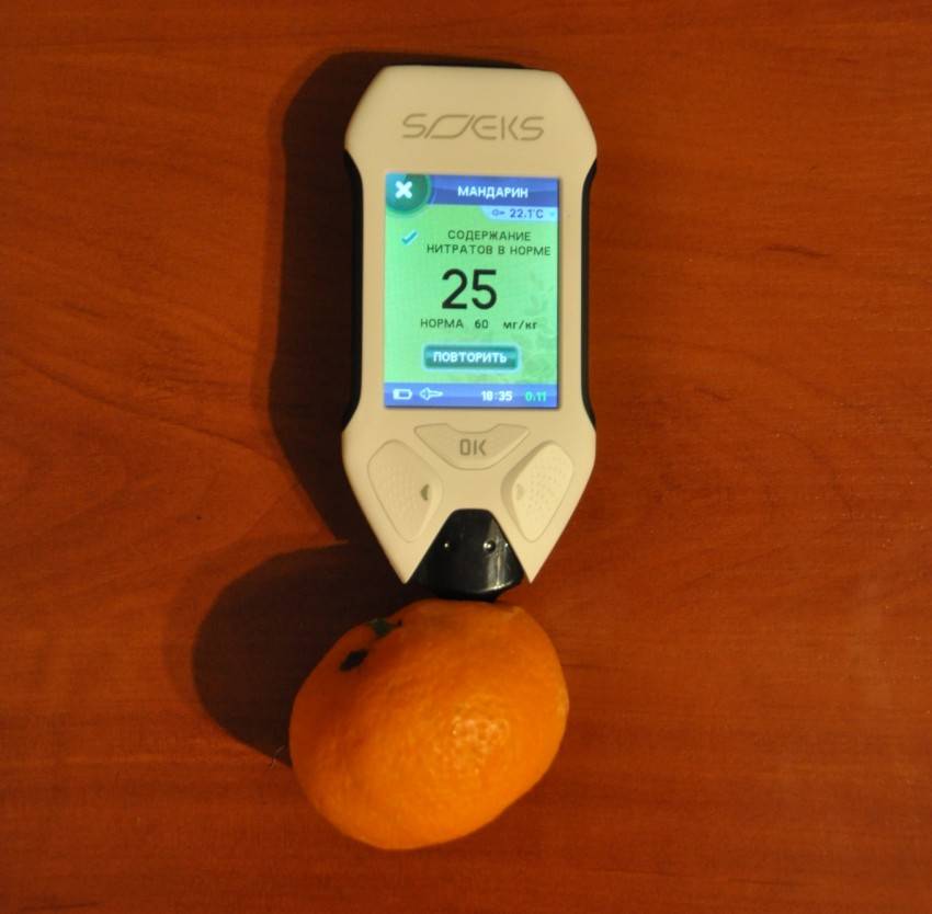 Устройство работает быстро. Чтобы выяснить качество продуктов, достаточно выбрать его из предоставленного списка и воткнуть внутрь устройство. Нормы по количеству нитратов уже есть в память устройства.