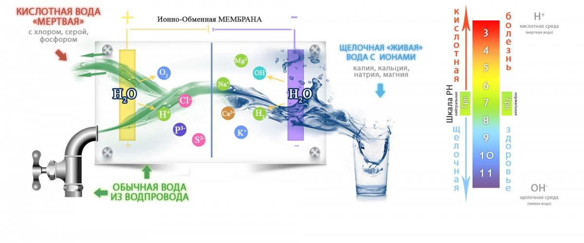 При получении ионизированной воды идет разделение на кислую и щелочную жидкость в разные емкости аппарата. Первая, то есть щелочная вода или католит характеризуется достаточно слабым отрицательным электрозарядом и имеет выраженные щелочные свойства, рН 7-12. Действие кислотной H2O или анолита выражается в незначительном положительным электрозаряде, где pH — от 7 до 2. Специальная перегородка агрегата не дает католиту и анолиту взаимодействовать между собой. В то же время данная мембрана беспрепятственно пропускает ионы.